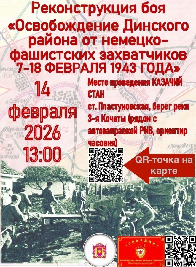 Уважаемые жители и гости Краснодарского края! Приглашаем Вас на масштабную историческую реконструкцию событий февраля 1943 года, которая состоится: 14-го февраля в 13.00 по местному времени. Место проведения Казачий стан станица Пластуновская берег реки 3-я Кочеты. Вас ждёт: выставка военных предметов ВОВ и СВО, оружие, техника. Выступление фольклорных коллективов. Организаторы: ККВИОО Гвардия совместно с Динским Районным Казачьим Обществом. Для посетителей вход свободный. Рекомендуется прийти заранее для удобного размещения. Приглашаем всех желающих окунуться в атмосферу прошлого и познакомиться с богатой историей нашего района. С уважением, ККВИОО Гвардия и Динское Районное Казачье Общество.